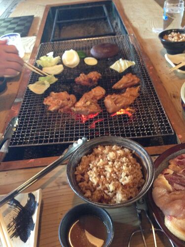 玉名温泉へ旅行の帰りに山鹿にある炉端焼きの人気店に♪ 対向車も少ない山道を進んでいると店舗が。これだけひっそりとした山奥にあるので人気だけどそんなに混んでないだろうと思ってたらビックリする程人がワラワラ…。12時前でしたが店舗前にも10数人いるし…